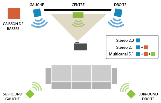 Le son 5.1 permet de profiter d'un film avec une expérience sonore optimale, à condition que celui-ci soit bien sûr en 5.1 et que les branchements soient correctement effectués. Cependant, comme le montre le schéma ci-dessus, une configuration stéréo sera plus facile à installer.